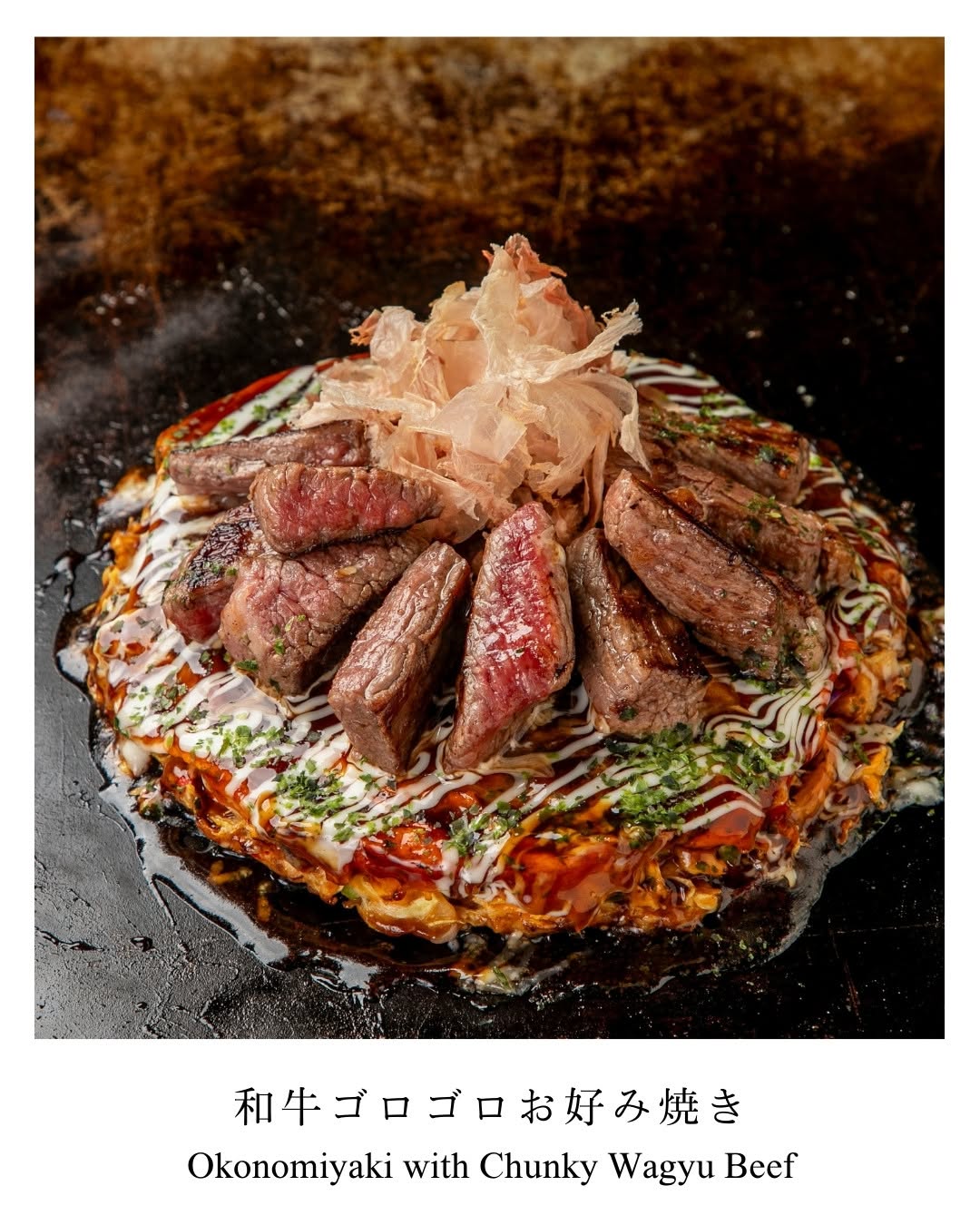 This luxurious okonomiyaki is topped with generous chunks of premium Wagyu beef.