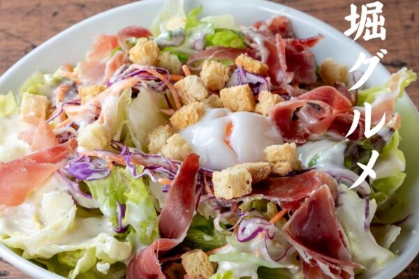 🏯 中座くいだおれビル3階! ぼんくら家プラスです✨ 当店のオススメをご紹介😊 【✨生ハムと温泉卵のシーザーサラダ✨】 生ハムと温泉卵をトッピングした 「生ハムと温泉卵のシーザーサラダ」は、 濃厚なド…